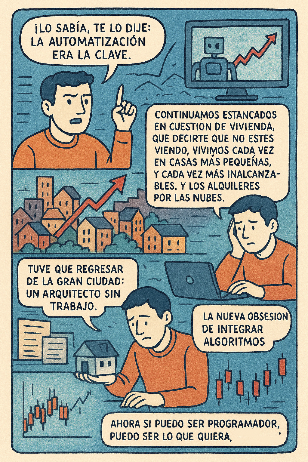 Y que mal fue mi elección: Continuamos estancados en cuestión de vivienda, que decirte que no estés viendo, vivimos cada vez en casas más pequeñas, y cada vez más inalcanzables. Y los alquileres por las nubes. Tuve que regresar de la gran ciudad: Un arquitecto sin trabajo, cuando hay mucha demanda, pero no se construye lo suficiente.
